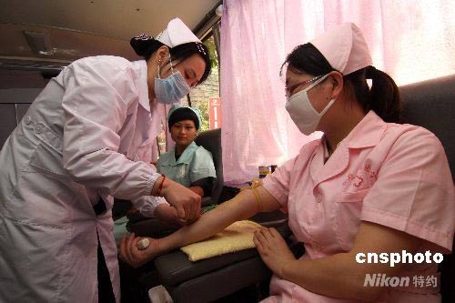 5月11日,湖南娄底市眼科医院的护士在献血。“5.12”国际护士节,娄底市眼科医院、娄底口腔医院、东方医院的100多位护士,在节日前无偿献血。中新社发 郭国权 摄