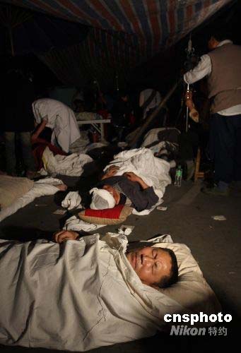 5月12日14时28分,在四川汶川县(北纬31度,东经103.4度)发生7.8级地震。图为受伤的灾民在街上接受救治。中新社发 黄荣 摄