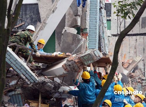 5月13日中午,四川省绵竹市汉旺镇东方汽轮机厂子弟学校——东汽中学的垮塌校舍里,被困近一天的学生被救出。12日,四川汶川县发生7.8级地震,而汉旺镇与汶川仅一山之隔,距离30余公里,受到严重破坏。中新社发 郭晋嘉 摄