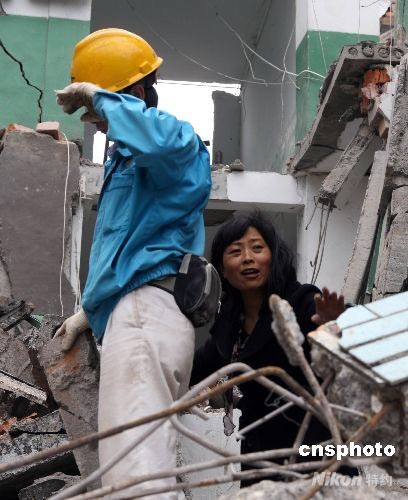 5月13日中午,四川省绵竹市汉旺镇东方汽轮机厂子弟学校——东汽中学的垮塌校舍里,一名被埋学生的家长紧张地呼救,盼望自己的孩子能尽快脱困。12日,四川汶川县发生7.8级地震,而汉旺镇与汶川仅一山之隔,距离30余公里,受到严重破坏。中新社发 郭晋嘉 摄
