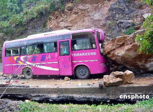 5月13日,通往四川省北川县的公路已分层变形,一辆被岩石击中的大巴车车头严重变形。12日的地震在该路段引起多处山体滑坡,不少车辆被滚石击中。中新社发 杜远 摄