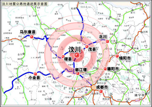 据来自交通运输部的消息,目前,四川省内所有高速公路均已恢复正常通行,成都、德阳、绵阳、雅安等受灾地区的主要干线公路也已抢通。但都江堰至汶川、理县至汶川、茂县至汶川、卧龙和映秀至汶川的公路损毁极为严重,交通部门正同时从东西南北四个方向全力抢通前往汶川的受损公路。