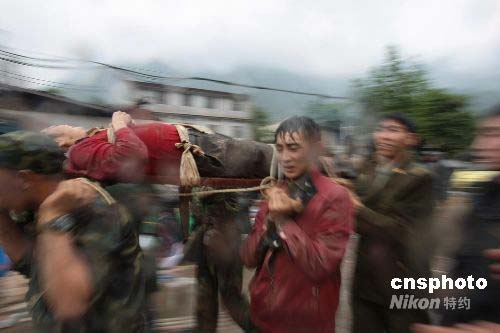 5月13日,中国空降兵6500多名官兵分别乘坐空军远输机奔赴四川重灾区,分五路兵力,分别在什邡、德阳、茂县、等重灾区展开救援。图为解放军士兵成功救出一名伤者。中新社发 谭超 摄