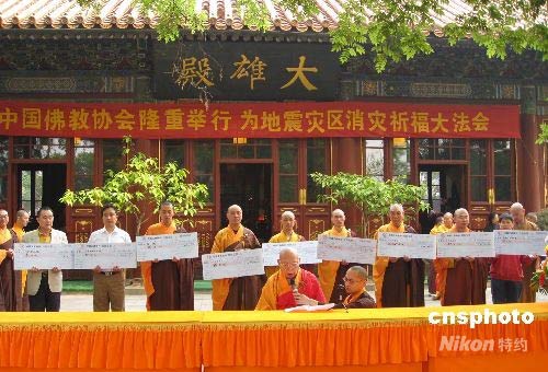 四川省汶川县发生七点八级地震后,中国佛教协会十四日上午在北京广济寺隆重举行消灾祈福大法会。现场赈灾捐款络绎不绝,十一世班禅大师捐款十万元人民币。中新社发 徐长安 摄