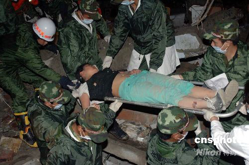 5月14日晨,在四川地震重灾区的北川,武警官兵正奋力搜救北川中学的被困学生。中新社发 邹宪 摄