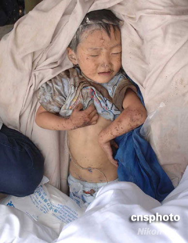 5月14日,四川省北川县一名从废墟中救出的儿童被安置在临时搭建的医疗点内,接受简单治疗后被送往临近的大城市。北川县是“5.12”四川大地震中受灾最严重的地区之一。中新社发 邹宪 摄