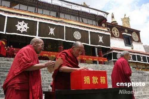 5月14日,在拉萨暴力事件发生两个月之际,藏传佛教西藏三大寺庙之一的拉萨哲蚌寺四百多僧人齐聚措钦大殿,将为四川汶川地震灾区民众举行祈福主题法会,并且,该寺僧众踊跃为灾区捐款,当场募集善款三万八千余元人民币。中新社发 柳俊武 摄