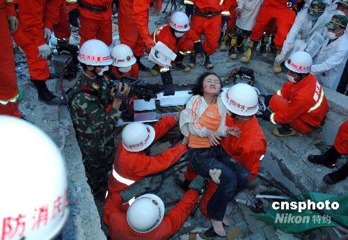 5月14日,重庆消防抗震救灾突击队官兵成功救出一名幸存者。13日晚19时30分,重庆消防抗震救灾突击队首批力量200名官兵历经12小时的长途奔袭,顺利抵达北川中学,并全面展开救援。截至14日下午19时,重庆消防抗震救灾突击队首批力量已成功从废墟中救出22条生命。中新社发 万明 摄