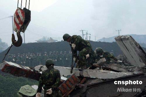 5月14日,中国空降兵某部已出动6500人在四川什邡县境内灾情最严重的洛水、红白等地紧急抢救被困群众。图为空降兵战士用铁钳剪断钢筋清混凝土救人。中新社发 谭超 摄
