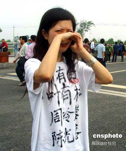 绵阳市抗震救灾最大的救助点九州体育馆容纳了2万多名来自北川、安县等地的灾民, 5月15日上午,北川地震灾民家属叶婷焦急地寻找亲人。中新社发 霍潺 摄