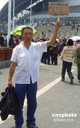 5月15日上午,来自受地震灾害较为严重的四川绵阳安县沸水镇的一名男子来到绵阳市抗震救灾最大的救助点——九州体育馆外举牌寻找亲人。中新社发 霍潺 摄