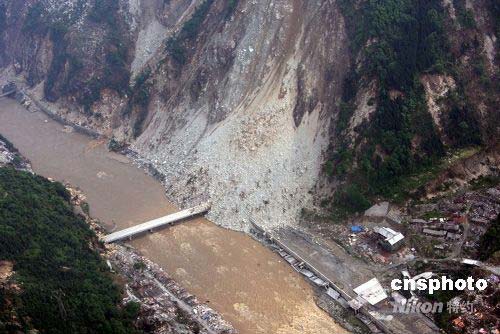 5月15日,在地震中中断的汶川县公路仍未完全修复,这是当日航拍的垮塌公路桥梁。此次大地震中,位于震中的汶川县附近道路受到严重破坏,救灾部队、人员和医疗、生活物资迟迟不能从陆路进入。中新社发 张雷 摄