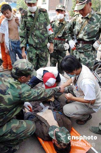 5月15日下午,解放军某部在北川地震重灾区任家坪村救出幸存者。中新社发 陈文 摄