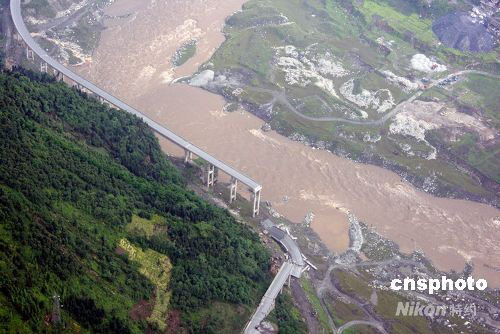 5月15日,在地震中中断的汶川县公路仍未完全修复,这是当日航拍的垮塌公路桥梁。此次大地震中,位于震中的汶川县附近道路受到严重破坏,救灾部队、人员和医疗、生活物资迟迟不能从陆路进入。中新社发 张雷 摄