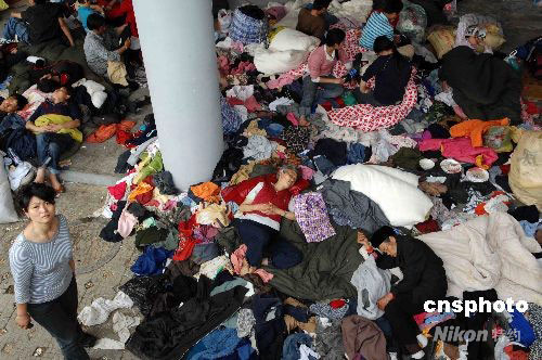 五月十五日,从四川绵阳北川羌族自治县等灾区救出的地震灾民被安置在成都九洲体育馆救助站接受救助,高峰期该救助站曾有三万余名灾民聚集。中新社发 陈文 摄