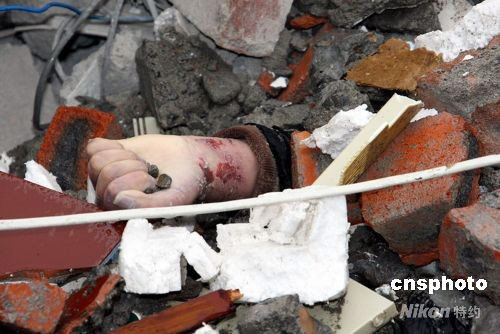 5月13日,被掩埋的北川中学学生。北川县是此次四川大地震中的重灾区之一。中新社发 张雷 摄