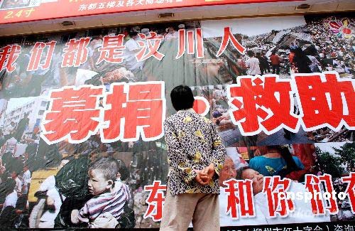 5月15日,柳州市民在观看震灾图片。当日,广西柳州市五星商业步行街上,墙面贴有抗震救灾的图片震撼着所有过往的市民。中新社发 小木木 摄