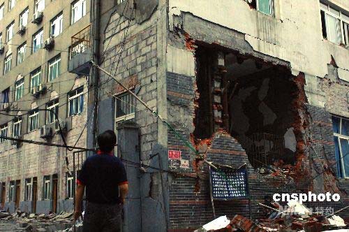 2008年5月15日,在地震灾区四川都江堰市,危楼排险工作在进行中。汶川7.8级地震,给都江堰市带来巨大破坏,市区大批居民楼成危楼。目前危楼的居民疏散安置工作已初步展开,取得阶段性成果。中新社发 邹宪 摄