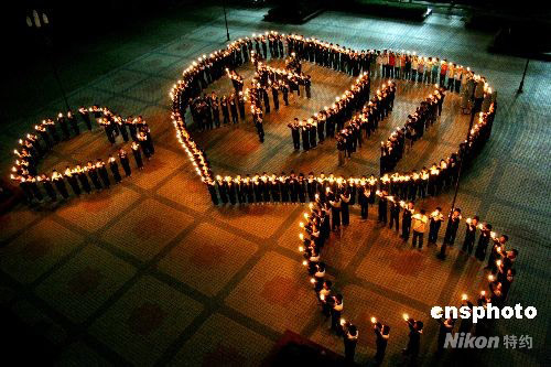 5月15日,在安徽省含山县第二中学,中学生手捧蜡烛组成爱心将“汶川”两字包围。当晚,安徽省含山县第二中学开展主题为“烛光祈心愿、爱心献汶川”的祈福和捐款献爱心活动,在自发捐款的同时,近千名中学生点燃蜡烛,组成“爱心包围汶川”的图案,为在四川汶川县强烈地震中遇难的同胞寄托哀思,同时为幸存者默默祝福,祝愿灾区群众早日度过难关。中新社发 程千俊 摄