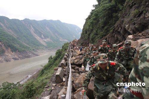来自交通运输部的最新消息,从北、东、南三个方向通往汶川的道路目前仍在紧急抢修中。已全线抢通的西线道路因再次发生滑坡、泥石流灾害,受损十分严重,目前塌方路段能够维持通行,但隐患较多。图为5月14日逾千官兵徒步紧急赶往受灾严重的映秀镇情景。中新社发 黄荣 摄