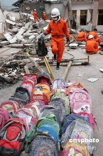 5月15日,在四川省什邡市红白镇中心小学废墟旁,河南省消防总队抗震救灾突击队的搜救人员将找到的孩子们的书包整齐排放,等待家长认领,以告慰生者。五颜六色的小书包仿佛一个个鲜活的幼小生命立于记者的眼前。 中新社发 张晓理 摄