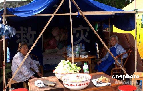 5月中旬,四川都江堰市地震灾区的灾民陆续住上了各种各样的防震棚。图为抗震中不忘操持家务的两位老人在地震棚中休息。中新社发 邹宪 摄