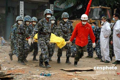 5月16日, 2750名海军陆战队官兵分三个梯队相继顺利到达四川地震灾区,立即展开救援行动。第一梯队到达绵竹县汉旺镇的760名官兵在灾情最严重的地方进行抢险救援,并在救援中使用了中国自行研制的生命探测仪。中新社发 李唐 摄