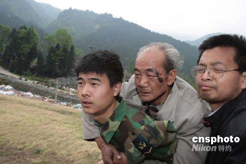 连日来,成都军区空军出动1300多名官兵奔赴抗灾一线,在四川重灾区紧急抢运危重伤员,为挽救幸存者生命赢得时间。图为5月15日,一名肩上扛着一条扛的列兵,艰难地把刚获救的老大爷背到安全地带的情景。中新社发 谭超 摄