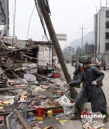 5月17日,一名解放军正给清理后的废墟消毒。四川地震重灾区德阳市下辖什邡市(县级市)红白镇已开始消毒防疫。中新社发 郭晋嘉 摄