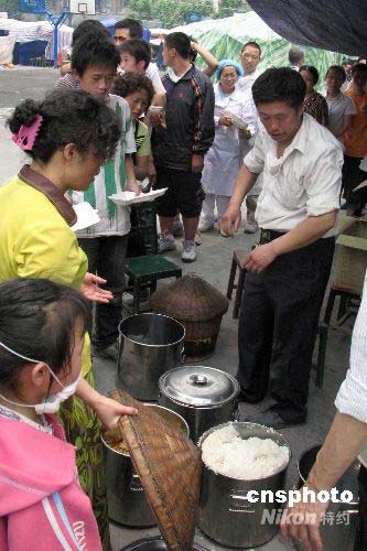 5月16日,四川都江堰一防震棚区民众吃午餐时得到80公里外一蔡姓农民全力救助。5月12日中国汶川大地震使四川都江堰市内绝大部分建筑出现致命性破坏,造成许多人员伤亡。居民自建许多防震棚,并在大棚中集体生活就餐。中新社发 邹宪 摄