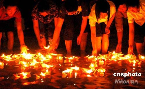 5月16日晚,安徽省芜湖市辣子村36位四川籍员工将亲手折叠的祈福船放入长江漂流,借烛光寄托思念,以漂船渡平安的表达方式,祈求家乡受灾的亲友战胜灾魔。中新社发 陈立希 摄