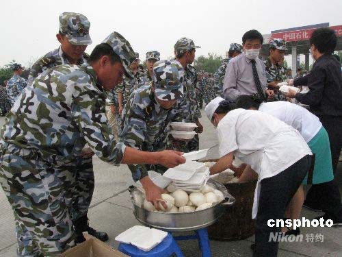 五月十六日十二点二十分许,一支从海南星夜兼程赶来的、有一千余名官兵组成的抗震救灾队伍到达成都成南高速路口加油站,早早等候在这里的成飞宾馆工作人员,迅速为战士们提供上盒饭、馒头等饭菜。仅二十分钟战士们就用完饭菜,稍事休整后就出发赶往受灾。中新社发 周丹钰 摄