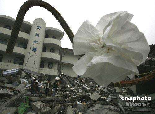 五月十七日,在汶川大地震中垮塌的灌县聚源中学废墟上,生存的同学把白花系在扭曲的教学楼钢筋上,沉痛悼念失去生命的五十多位师生。中新社发 贾国荣 摄