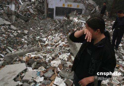 五月十七日,一位哭肿双眼的母亲徘徊在汶川大地震中垮塌的灌县聚源中学废墟上,在她失踪的十四岁儿子上课位置寻找课本书包没有结果,泪流不停。中新社发 贾国荣 摄