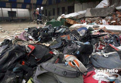 五月十七日,在汶川大地震中垮塌的灌县聚源中学废墟夺取了五十多位师生的宝贵生命,疾病控制人员今天开始对残留的学生书包喷洒消毒药。中新社发 贾国荣 摄