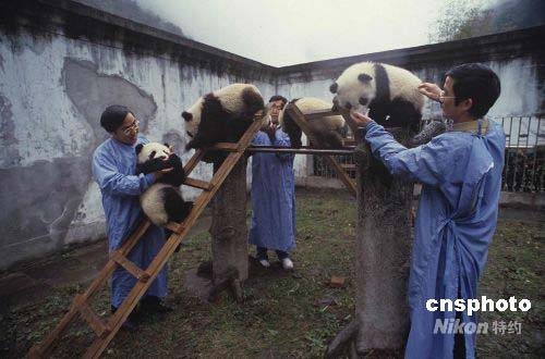 四川省汶川县发生里氏7.8级强烈地震后,位于震中的卧龙大熊猫保护区通讯和交通全部中断,与外界失去联系。16日,两名保护区工作人员携带卫星电话坐直升飞机降落到卧龙以后,得到最新消息:繁育基地的大熊猫圈舍损毁严重,14座完全损毁,18座严重损毁,但因为有围墙,绝大部分大熊猫目前安全。幼仔已被转移到平缓的安全地带,但暂住条件相对拥挤。图为地震之前,卧龙研究人员在精心照顾大熊猫幼仔。中新社发 罗小韵 摄