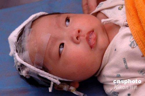 2008年5月17日下午,四川大学华西医院抗震救灾急诊部门,接来一位出生刚80天,来自地震重灾区四川绵竹的女婴,她的名字叫廖静萱。廖静萱目前脑部出现脑水肿,可能将要进行脑部手术,其右腿也带有地震创伤。中新社发 邹宪 摄