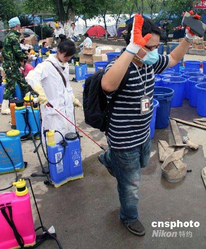 5月17日,四川绵竹汉旺地震灾区卫生防疫人员展开消毒防疫工作,图为卫生员为在灾区采访的记者消毒。中新社发 齐彬 摄