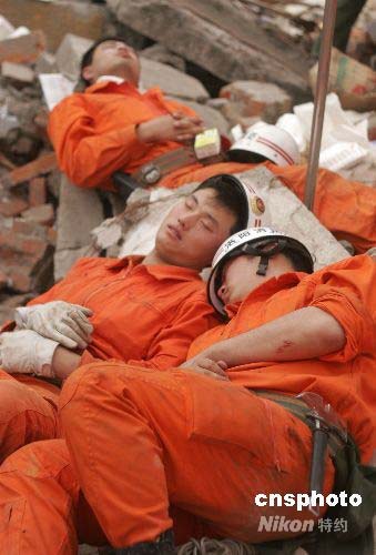 5月17日,在四川省什邡市鎣华镇、红白镇等抢险现场,连续作战的洛阳消防抢险救援突击队队员们躺在瓦砾上小憩片刻。在四川地震灾区,解放军、武警、公安、边防、消防官兵以及民兵、医疗救护人员和志愿者们,不怕危险,不畏疲劳,为抢救每一条宝贵的生命连续奋战。他们是最可爱的人!中新社发 张晓理 摄