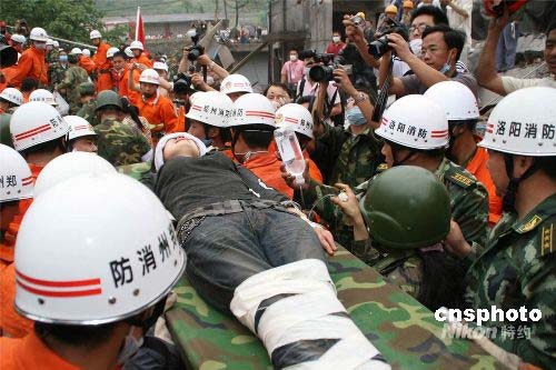 5月17日晚18时30分,在地震重灾区四川什邡市蓥华镇,郑州消防支队所在的河南总队抗震救灾突击队第一梯队成功营救一名被废墟埋压124小时的妇女。中新社发 申治民 摄