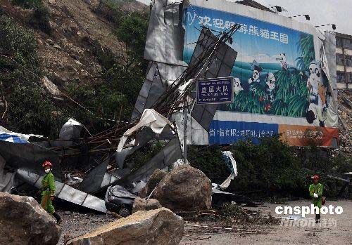 两名武警搜救队员5月17日在映秀镇通往卧龙的303公路上巡查。5月12日发生的四川汶川大地震,将映秀镇通往中国国宝大熊猫最主要保护区卧龙的303公路几乎彻底摧毁。有专家称,这条公路短期内无法修复。中新社发 任晨鸣 摄