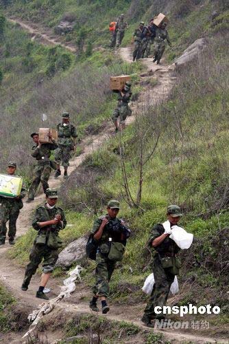 5月17日,济南军区某部600多名官兵手拿肩扛徒步到达汶川县映秀镇送上灾民急需的药品。中新社发 张雷 摄