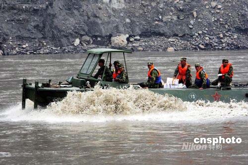 5月17日,成都军区某部出动军用船只运送四川地震灾区的灾民。中新社发 张雷 摄