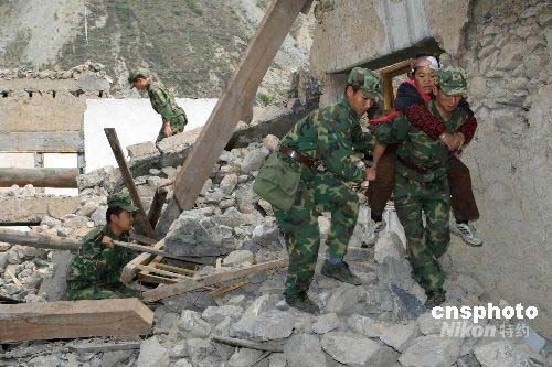 5月18日上午9时50分,成都军区驻渝某集团军搜救小分队在四川省茂县南兴镇救出55岁受伤妇女苟世英。中新社发 高效文 摄