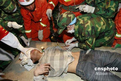 5月16日,四川陆军预备役高射炮兵师二团官兵在什邡县蓥丰化工厂,与郑州消防官兵协同作战,营救出2名被困105小时的幸存者。中新社发 钟 敏 摄