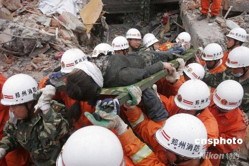5月17日18时18分,四川省什邡市鎣华镇鎣华实业有限公司31岁女工卞刚芬在震后本厂综合大楼废墟下被埋124小时后,经河南消防抢险救援突击队连续31小时的艰苦营救后奇迹生还,她意识清醒,对周围的人们说着“感谢”。中新社发 张晓理 摄