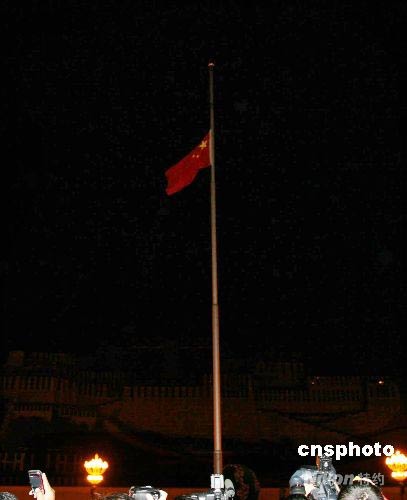 五月十九日凌晨零点时分,西藏自治区在布达拉宫广场举行降半旗仪式,向“五·一二”四川大地震死难同胞致哀,此举为新中国成立以来,布达拉宫广场首次为死难普通民众降半旗。中新社发 柳俊武 摄