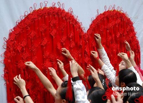 5月18日,太原体育西路埃坷拉商务酒店的员工将自己编织的爱心结挂在祝福墙上,祝福地震灾区汶川。中新社发 宇星 摄