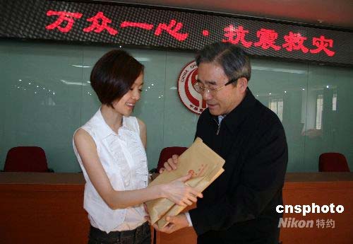 2008年5月18日下午,刚从四川汶川地震灾区采访回来的凤凰卫视主持人陈鲁豫来到北京中华慈善总会,代表个人向四川汶川地震灾区捐赠人民币15万元,为帮助灾区人民献上自己的一份爱心。陈鲁豫还与中华慈善总会范宝俊会长进行了亲切的交谈,并表示希望与慈善总会合作继续为抗震救灾效力。中新社发 郭海鹏 摄