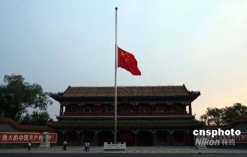 5月19日清晨,北京新华门下半旗,哀悼5·12汶川大地震中遇难同胞。中国国务院作出决定,5月19日至21日为全国哀悼日。在此期间,全国和各驻外机构下半旗志哀,停止公共娱乐活动,中国外交部和中国驻外使领馆设立吊唁簿。5月19日14时28分起,全国人民默哀3分钟,届时汽车、火车、舰船鸣笛,防空警报鸣响。中新社发 张宇 摄